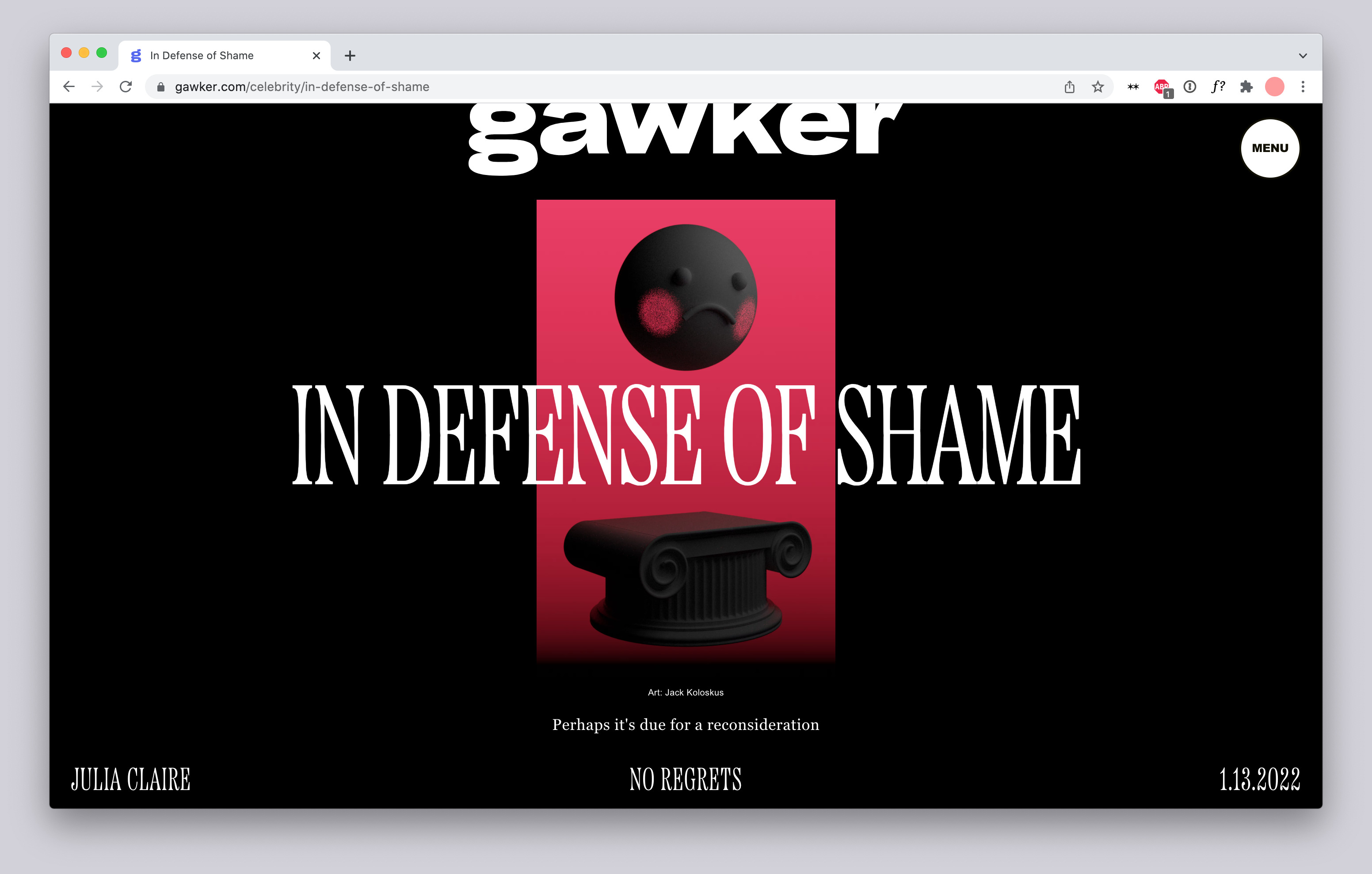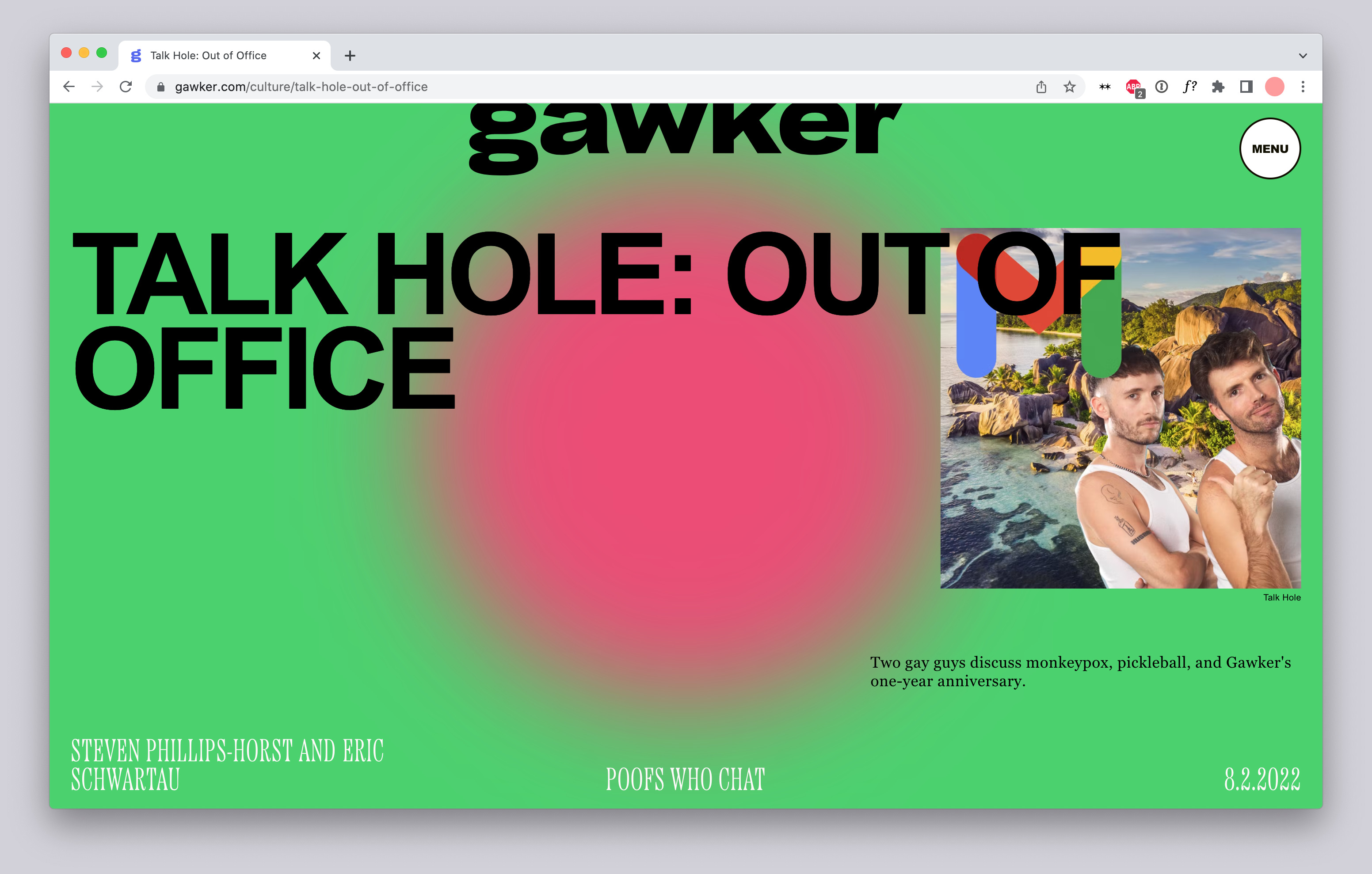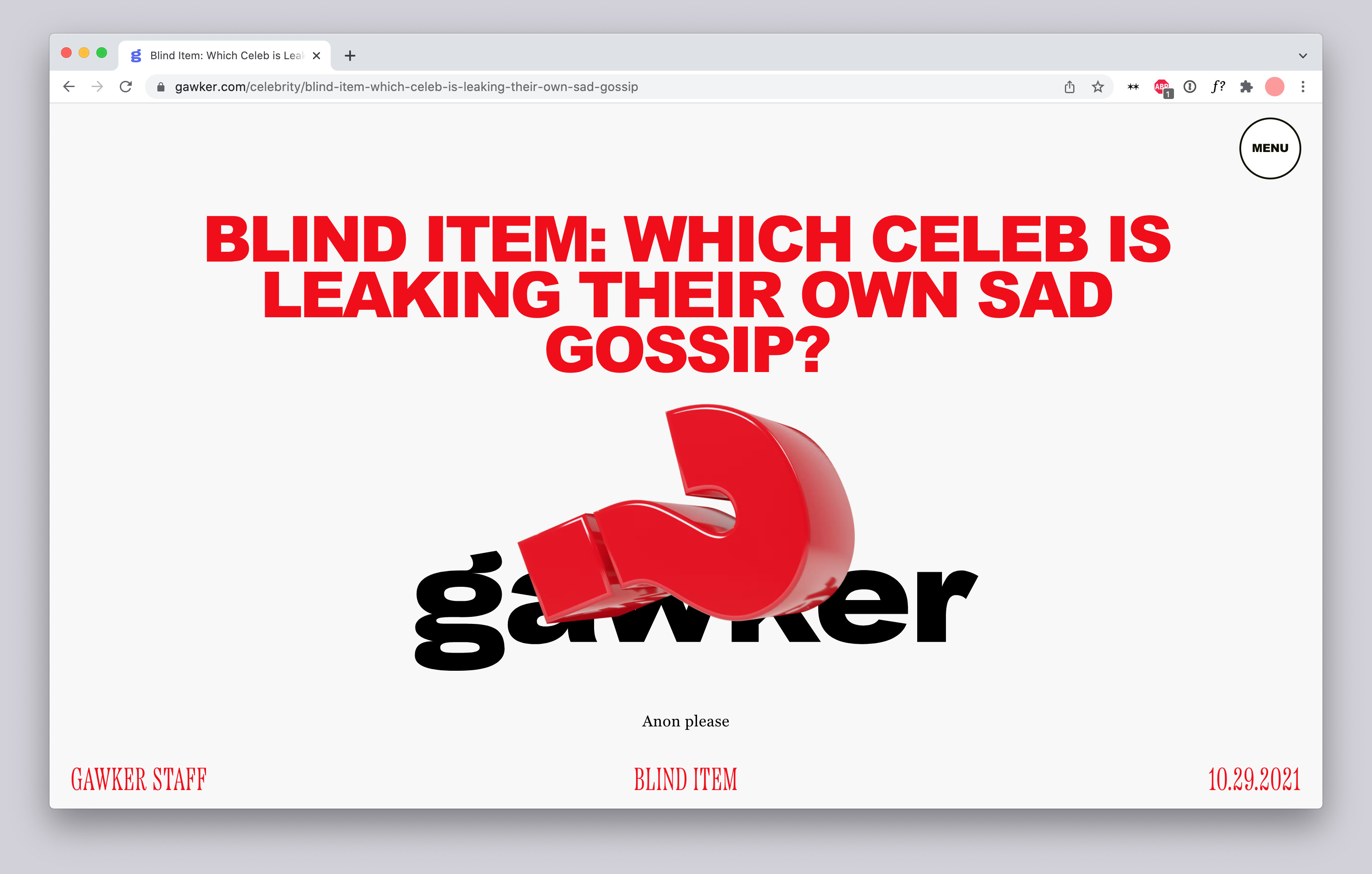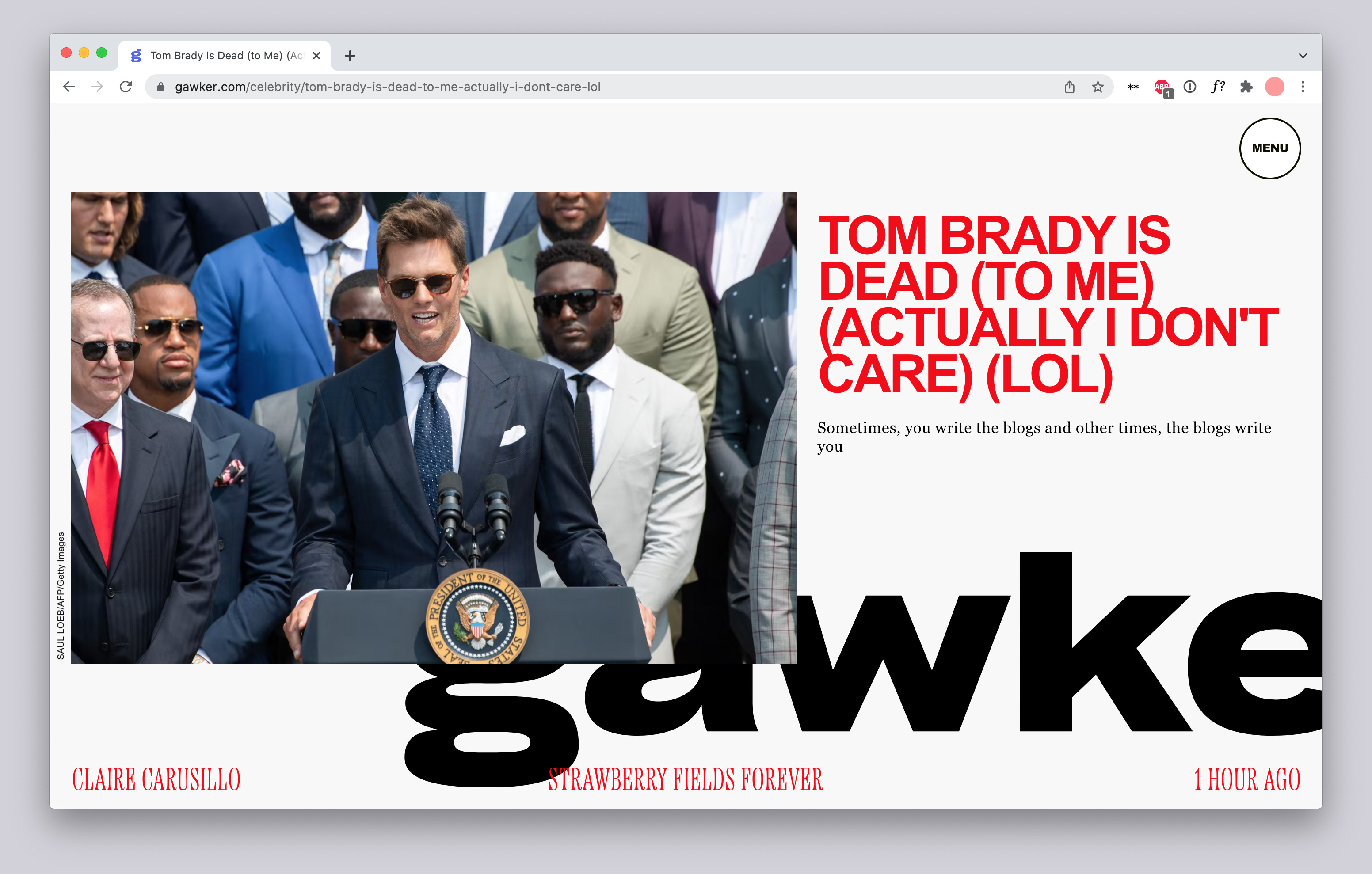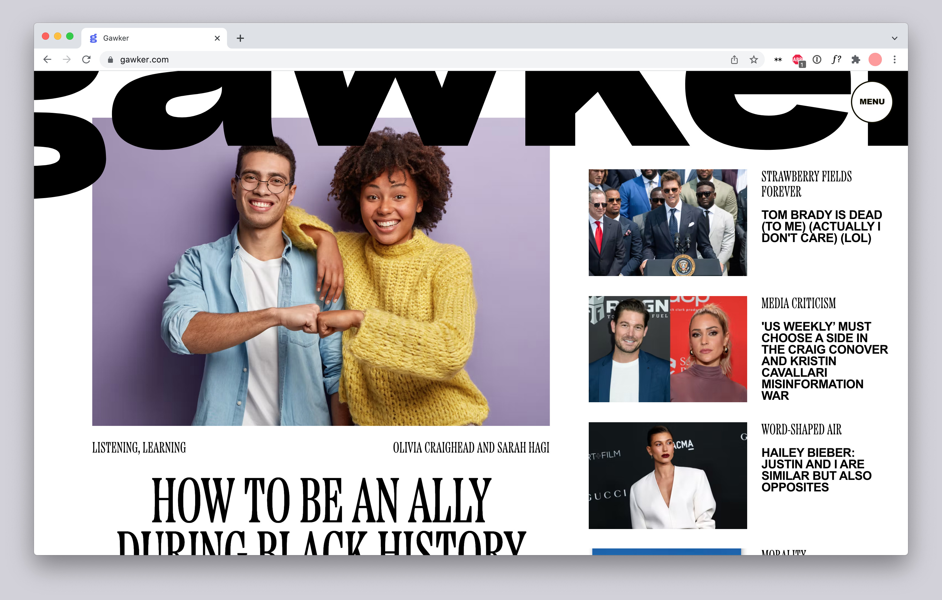 In November 2020 BDG began the relaunch process for Gawker under Leah Finnegan. Gawker helped usher in the blog era, and we paid tribute to that by using two fonts emblematic of the time: Arial and Georgia, Gawker's two original fonts. We also added a standout typeface, Mark Simonson's Etna, to separate the aesthetic from generic web brutalism.