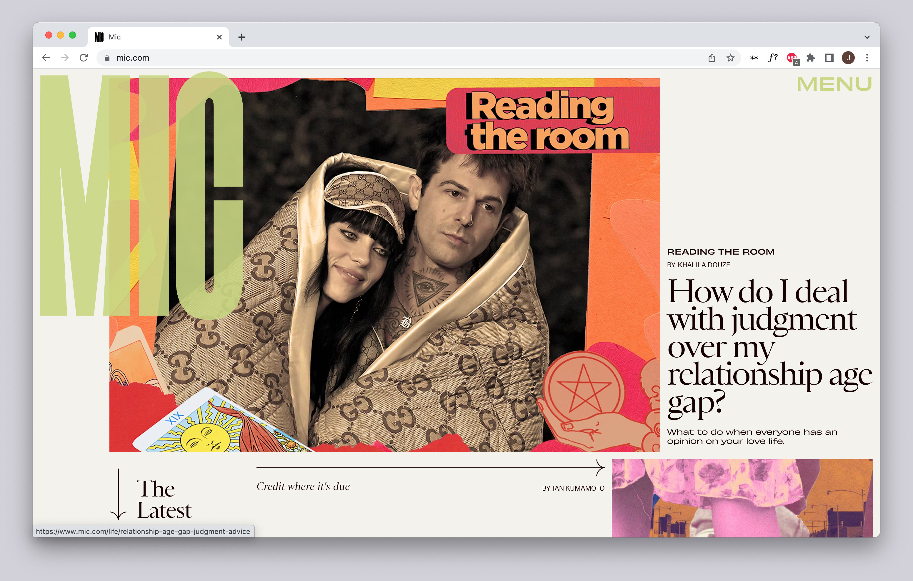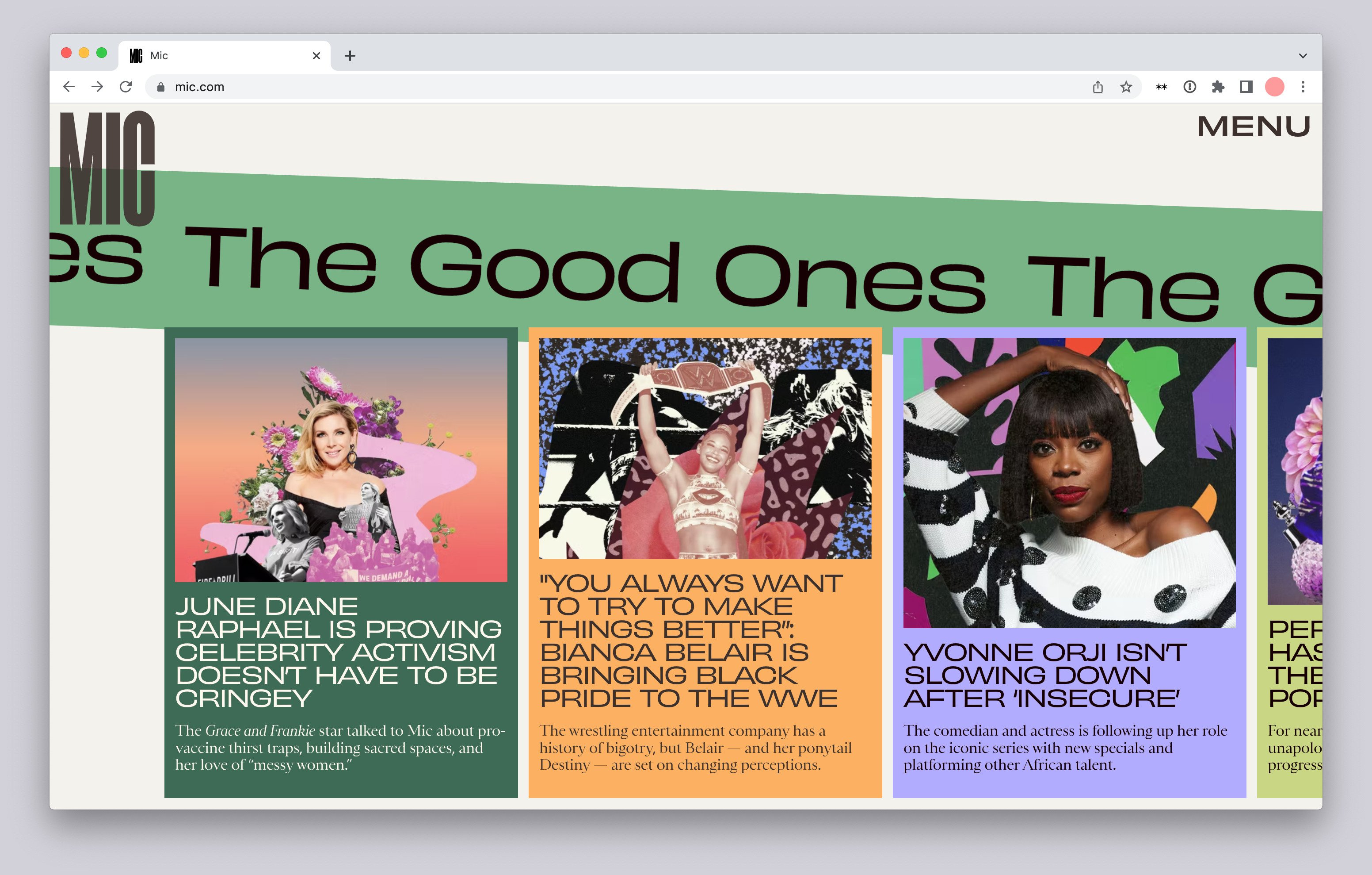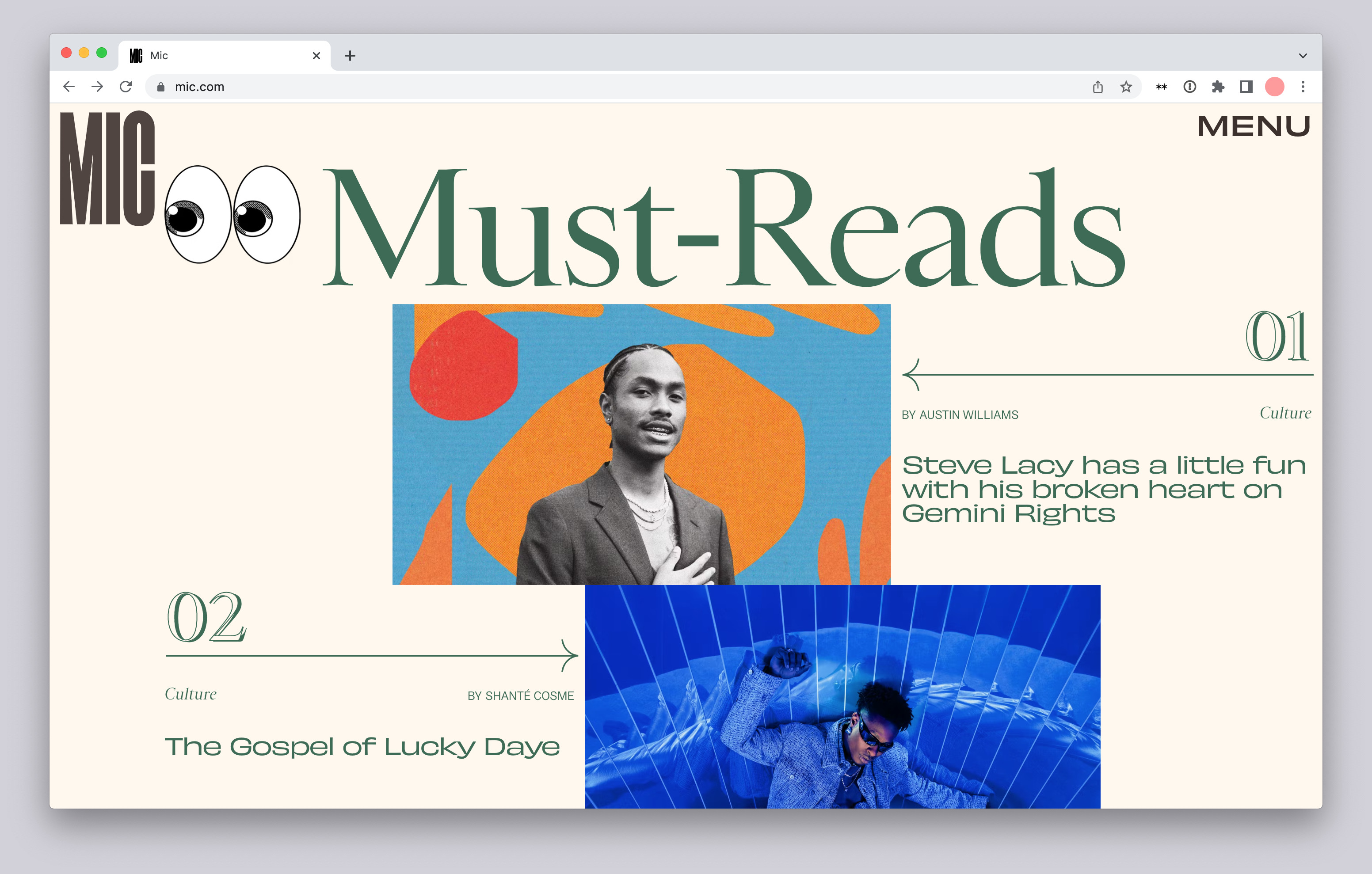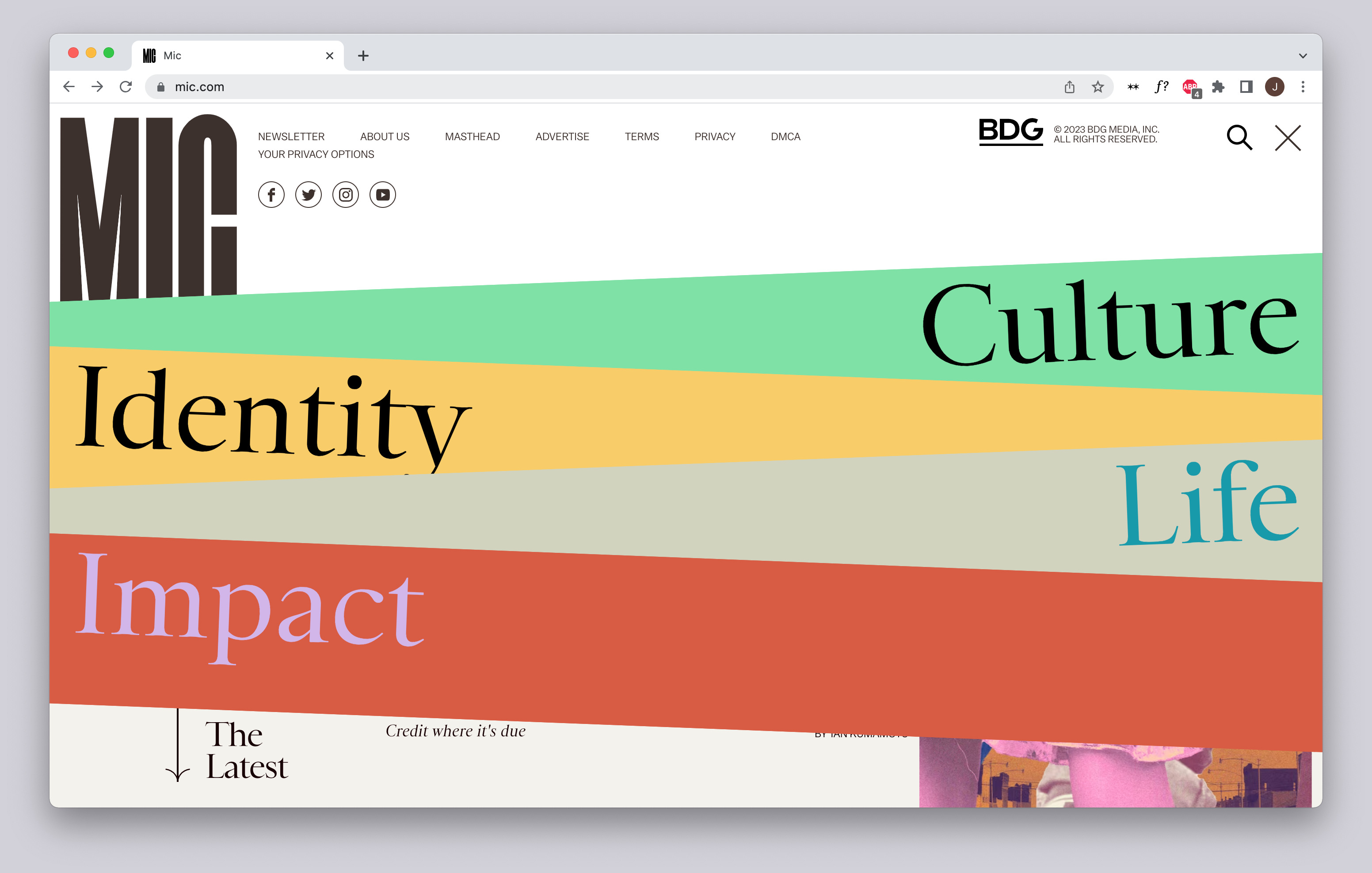 Branding and site design work for a rebrand of Mic under BDG. The goal was to shift Mic from a solely policy-focused site to one that could also be a voice of authority while covering culture.